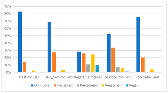 Significant differences were identified between data-driven dietary patterns (PCs, Figure 1) and respondents’ self-reported dietary pattern (χ2 (16) = 299.138, p < 0.001) (Figure 1). Omnivores were substantially more likely to be within the “meat-focused” and “potato-focused” groups and unlikely to be in the “vegetable-focused” group. Flexitarians and pescatarians were likely to be in the “seafood-focused” group and not the “meat-focused” group. Pescatarians, vegetarians, and vegans were all likely to be in the “vegetable-focused” group and unlikely to be in the “meat-focused” and “dairy/ovo-focused” groups.