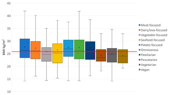 Self-reported flexitarians exhibited the highest BMI of 26.58 kg/m2, while self-reported pescatarians had the lowest median BMI of 23.43 kg/m2 (Table 6). The “potato-focused” diet had the highest reported median BMI of 26.88 kg/m2, whereas the “vegetable-focused” diet had the lowest at 24.68 kg/m2. A significant association was identified between calculated BMI and self-reported diet (F(4) 19.778, p < 0.001) with post-hoc tests identifying self-reported omnivores and flexitarians as having a significantly higher BMI than vegetarians. As shown (Figure 3), self-reported omnivores and flexitarians had a higher BMI higher than the sample median of 25.89 kg/m2. Significant associations were also found between respondents attributed dietary pattern and calculated BMI (F(4) = 19.008, p < 0.001); the median BMI (24.68 kg/m2) of the “vegetable-focused” diet was significantly lower than the median BMI (26.88 kg/m2) of the “potato-focused” and “meat-focused” (26.26 kg/m2) dietary patterns.