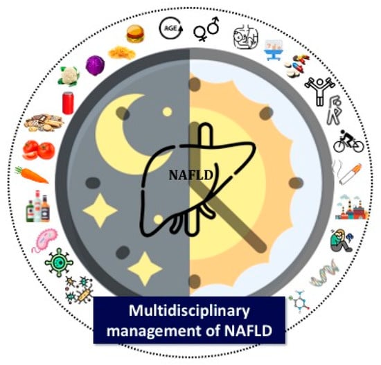 Multidisciplinary management of NAFLD. Environmental factors such as nutrient intake and exposure or physical activity, genetics, epigenetics or microbiota composition have been shown to be associated with NAFLD. Similarly, an individual’s chronotype influences the development of this disease, being important to consider it along with the aforementioned factors for an accurate and comprehensive management of these patients. Abbreviations: NAFLD, non-alcoholic fatty liver disease.