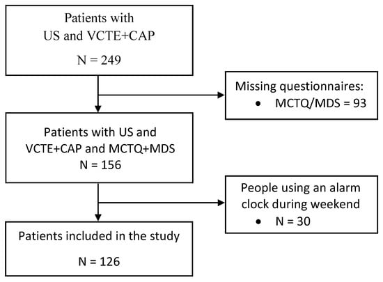 From a cohort of 249 consecutively per referral enrolled patients with a diagnosis of NAFLD already achieved by ultrasound (US), the present study included 126 individuals enrolled between October 2019 and October 2022 at the outpatients clinic of the Unit of Gastroenterology, Città della Salute e della Scienza di Torino—Molinette Hospital. This study was examined and approved by the Intercompany Ethics Committee A.O.U. Città della Salute e della Scienza di Torino—A.O. Ordine Mauriziano—A.S.L. Città di Torino. We included in the analysis 126 patients who underwent vibration controlled transient elastography (VCTE) with assessment of controlled attenuation parameter (CAP) (FibroScan®530, Echosens, Paris, France), who were administered the Munich Chronotype Questionnaire (MCTQ) and the Mediterranean Diet Score (MDS) (Figure 2). Subjects with other causes of liver disease such as chronic viral hepatitis (hepatitis B and C), autoimmune liver disease, hereditary haemochromatosis, α1-antitrypsin deficiency, Wilson’s disease or drug-induced liver damage and subjects with alcohol-induced liver disease, obtained with a self-reported negative history of alcohol abuse defined as a weekly ethanol consumption <140 g for women and <210 g for men [24], were excluded from the analysis. Subjects aged ≥ 18 years signed the informed consent for participation in the study.