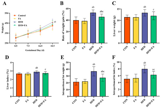 Maternal body weight, liver weight, and adipose tissue weight. (A) Maternal body weight. (B) Rate of body weight gain. (C) Liver weight. (D) Liver index. (E) Intraperitoneal fat weight. (F) Intraperitoneal fat index. Data are represented as means ± SD (n = 8). A significant difference (p < 0.05) is denoted by different letters: a vs. the CON group; b vs. the FA group; c vs. the HFD group.