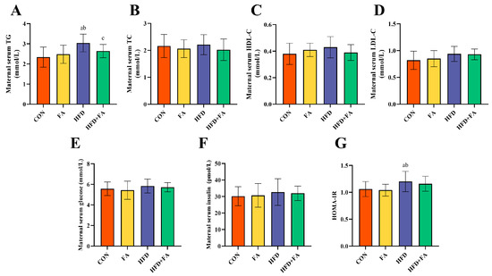 Maternal serum biochemical index. (A) Serum TG; (B) Serum TC; (C) Serum HDL-C; (D) Serum LDL-C; (E) Serum glucose; (F) Serum insulin; (G) HOMA-IR; data are represented as means ± SD (n = 8). A significant difference (p < 0.05) is denoted by different letters: a vs. the CON group; b vs. the FA group; c vs. the HFD group.