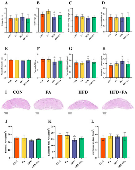 Fetal and placental development. (A) Litter size. (B) Fetal weight. (C) Fetal crown-rump length. (D) Placental weight. (E) Placental diameter. (F) Placental efficiency (fetal/placental weight ratio). (G) Placental TG. (H) Placental TC. (I) The morphology of the placentas; scale bar 1 mm; LZ, labyrinth zone; JZ, junction zone. (J) Placenta area. (K) LZ area. (L) JZ area. Data are represented as means ± SD (n = 8). A significant difference (p < 0.05) is denoted by different letters: a vs. the CON group; b vs. the FA group; c vs. the HFD group.