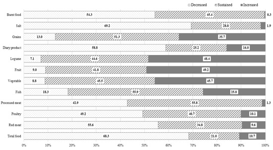 In accordance with the cancer prevention recommendations of the World Cancer Research Fund (WCRF)/American Institute for Cancer Research (AICR) [19], we established a “healthier dietary change” as follows: (1) a reduced consumption of red and processed meat, grains, salt, and burnt food; (2) an increased consumption of poultry, fish, vegetables, fruit, legumes, and dairy products as valuable sources of protein and micronutrients. We viewed a decrease in grain intake as a healthier dietary change, given that Asians tend to consume extremely high-carbohydrate daily diets (>70% of energy), consisting of various refined grains such as white rice and noodles [20,21], compared with the Western population [22]. In addition, we calculated a dietary change score for each participant, by tallying the total number of dietary changes in a healthier direction across 11 individual food categories.