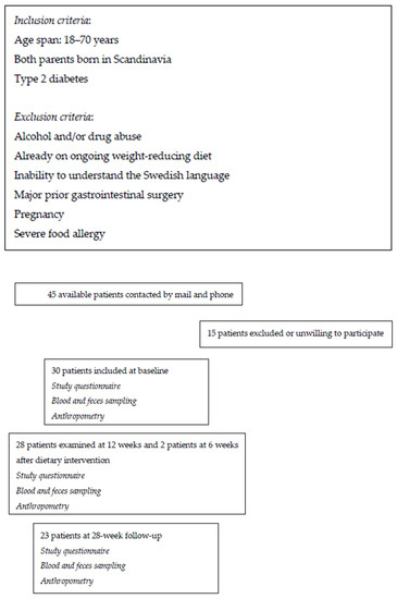 - Huang, F.; Nilholm, C.; Roth, B.; Linninge, C.; Höglund, P.; Nyman, M.; Ohlsson, B. Anthropometric and metabolic improvements in human type 2 diabetes after introduction of an Okinawan-based Nordic diet are not associated with changes in microbial diversity or SCFA concentrations. Int. J. Food Sci. Nutr. 2018, 69, 729–740. [Google Scholar] [CrossRef]