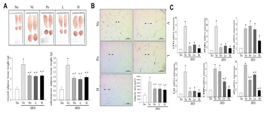 Effects of CGWE on Fat Weight and Adipocyte Size. (A) Abdominal fat tissues were collected from C57BL/6 mice in different treatment groups: No, HFD + vehicle, HFD + Po, or HFD + CGWE. The weights of epididymal and perirenal fat were measured. (B) Representative microscopic images of epididymal fat tissue sections stained with hematoxylin and eosin at a magnification of ×200. The graph shows the area of adipocytes. (C) Gene expression analysis of adipogenesis and lipogenesis-associated genes in liver tissue using RT-qPCR with specific primers. * p < 0.05 vs. the No group; # p < 0.05 vs. the HFD + Ve-treated group.
