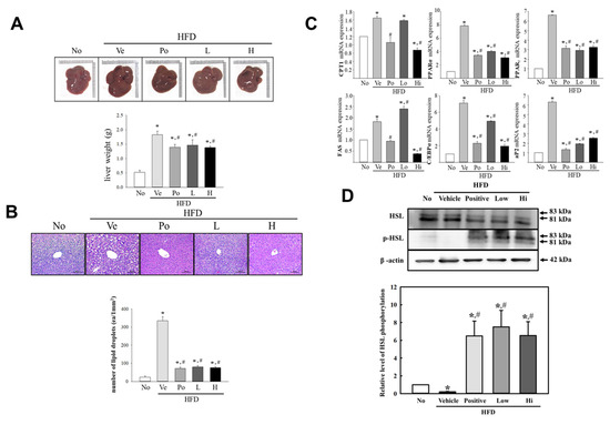 Hepatic weight changes and steatosis are common features observed in obesity [4,15]. To explore CGWE’s impact on hepatic fat accumulation and lipolysis in obese mice, we conducted an 8-week study, subjecting C57BL/6 mice to a HFD while administering CGWE. We examined hepatic tissue changes to assess the effects. While there was a tendency for increased hepatic weight in the HFD + vehicle group compared to the untreated group, the difference was not statistically significant (Figure 3A). Similarly, hepatic tissue exhibited parallel patterns of lipid droplet accumulation. Significant variations in the number of lipid droplets were observed in the H&E-stained hepatic tissue sections among all groups. The HFD + vehicle group displayed a substantial increase in the number of lipid droplets, while the HFD + CGWE group showed a significant decrease (Figure 3B). To evaluate hepatic lipolytic activity, we examined changes in the mRNA expression of key proteins associated with neutral lipid metabolism, including CPT1, PPARα, PPARγ, FAS, C/EBPα, and aP2. The HFD + vehicle group demonstrated upregulation of these proteins’ mRNA expression levels. In contrast, the HFD + CGWE group showed a concentration-dependent decrease in their expression. The HFD + Po treatment also resulted in a significant decrease (Figure 3C). Furthermore, we investigated the phosphorylation of hormone-sensitive lipase (HSL) as an indicator of hepatic lipolysis. While no significant changes were observed in the untreated and HFD + vehicle groups, there was a noteworthy tendency towards a significant increase in the HFD + CGWE group (Figure 3D).