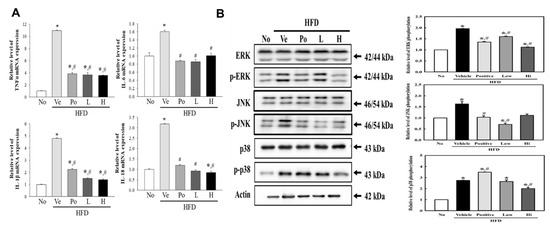 Hepatic Inflammatory Response and MAPK Signaling Pathway. (A) mRNA expression levels of IL-1β, IL-6, TNF-α, and NF-κB in liver tissue were analyzed using qRT-PCR. * p < 0.05 vs. No treatment group; # p < 0.05 vs. HFD + vehicle-treated group. (B) Western blotting analysis of p-JNK, JNK, p-ERK, ERK, p-p38, p38, and β-actin proteins in liver homogenates to assess MAPK signaling pathway activation. Representative bands shown. * p < 0.05 vs. the No group; # p < 0.05 vs. the HFD + Ve-treated group.