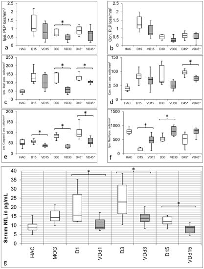 Quantification of IHC staining. PLP loss is displayed in the first row in (a) on the ipsilateral and (b) contralateral side with a similar pattern. No cortical demyelination is detectable in HAC, and demyelination is most pronounced in d15 animals, with more PLP preservation in VD+ animals. Also, d30 (p = 0.05) and d45* animals show more PLP loss when not supplemented with VD. Iba1 quantification is shown in (c) on the ipsilateral side and (d) contralateral side with a comparable trend. Microglial activation is lower overall in VD+ animals with a significant difference on the ipsilateral side on d30 (p = 0.004) and d45* (p = 0.018), as well as on the contralateral side on d45* (p = 0.038). Quantification of apoptotic cells is shown in (e) on the ipsilateral side, with a significant reduction on d15 (p = 0.002), d30 (p = 0.004) and d45* (p = 0.023) in VD+ animals. The preservation of neurons in VD+ animals is shown in (f) on the ipsilateral side, with a significant result on d15 (p = 0.019) and d30 (p = 0.019). Asterisks indicate significant differences. In diagram (g), there is a significant increase of NfL detectable after MOG immunization compared with HAC (p < 0.001). In comparison to HAC, all VD− animals showed a significant increase in NfL serum levels (d1, p < 0.001; d3 p < 0.001; d15 p = 0.020). This pattern changes in VD+ animals, where only d3 animals differ significantly from HAC (p = 0.008). Although all groups show a similar trend over d3 to d15 after cytokine injection, VD+ animals have significantly lower NfL serum levels on all days (d1, p = 0.027; d3, p = 0.033; d15, p = 0.006). Asterisks indicate significant differences.