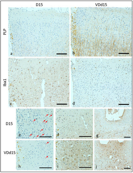 Representative microscopic pictures of histological results are displayed in Figure 2, and all scale bars represent 100 µm. In Figure 2a, the PLP loss of a representative d15 animal is shown with hardly any PLP fibers remaining. In comparison, Figure 2b shows a VD-supplemented d15 animal, where the PLP structures are still clearly visible. The microglial activation is much higher in d15 animals (Figure 2c) than in VD+ animals (Figure 2d). Apoptotic cells are also reduced in VD+ animals on d15 (Figure 2e, VD−, h, VD+). Neurofilament structures are better preserved in VD-supplemented animals in comparison to normal d15 animals (Figure 2f,i). Astrocytic reactions are more pronounced in VD+ animals (Figure 2g,j).