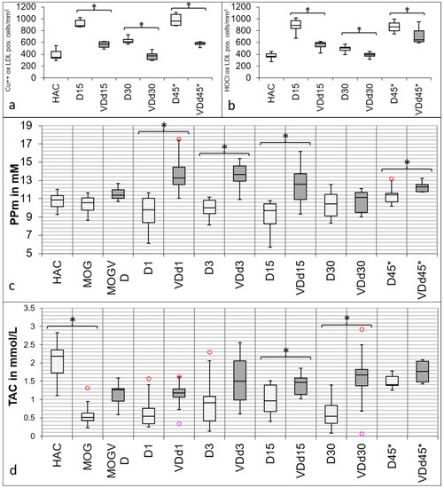 Both markers for oxidative stress show a similar trend towards the experimental groups (Figure 3a,b) with a peak in d15 animals and d45* animals. Overall, there is a significant reduction in VD+ animals detectable in both markers on d15 (Cu++-oxLDL p = 0.002; HOCl-oxLDL p < 0.001), d30 (Cu++-oxLDL p = 0.004; HOCl-oxLDL p = 0.042), and on d45* (Cu++-oxLDL p < 0.001; HOCl-oxLDL p < 0.001).