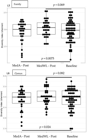 Box plots of Shannon Diversity at the family and genus levels. Baseline represents baseline values from both groups. MedA—post and MedWL—post are post-intervention values.