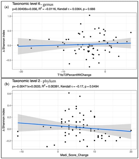Scatter plot with a linear regression overlay comparing change in Shannon index with percent weight change (a) and MED score change (b). The p-value is for the Kendall tau statistic.