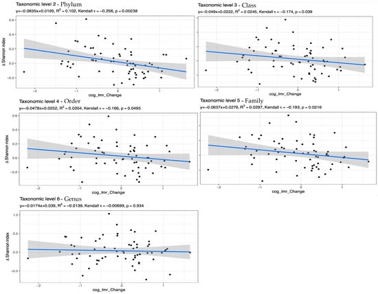 Scatter plots with linear regression overlays illustrating the relationship between change in the Shannon index over time and change in LMR scores over time. The p-value relates to the Kendall tau statistic.