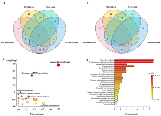 Venn diagrams illustrate the overlap and number of differential metabolites (pre- vs. post-FMT) among the various therapeutic groups in the negative mode (a) and positive mode (b). The numbers in the red circles represent the number of differential metabolites shared in the remission and response groups, non-remission and non-response groups in positive and negative ion modes, respectively. Pathway and enrichment analyses of differential metabolites (pre- vs. post-FMT) in the response group. Bubble diagram of metabolic pathway enrichment based on the differential metabolites (pre vs. post FMT) in the response group (c). One bubble represents one metabolic pathway. Data is plotted as significance (−log10(p)) versus pathway impact. The top 23 enrichment pathways are listed on the right (d).
