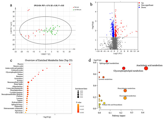 Analysis of serum metabolic profiles at baseline between the remission and non-remission groups. Comparison of the baseline serum metabolome (positive mode) of UC patients based on OPLS–DA among the remission and non-remission groups (a). Volcano plots of differential metabolites (positive mode) between the remission and non-remission groups; gray dots represent metabolites with no significant change, red dots represent up-regulated metabolites, and blue dots represent down-regulated metabolites (b). The top 25 enriched metabolite sets based on main class are listed in (c). Bubble diagram of metabolic pathway enrichment based on the differential metabolites between the remission and non-remission groups at baseline (d). OPLS–DA, orthogonal partial least squares–discriminant analysis.