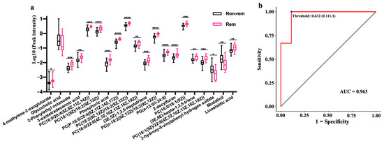 We further explored the potential role of serum metabolites in predicting clinical remission following FMT in UC patients. Using the Boruta method [16], we selected 20 metabolites from a total of 2148 as variables for RF modeling. Nineteen of these variables were significantly different between the two groups at baseline (Figure 5a). Nine of these variables were GPCs and glycerophospholipids. The AUC, accuracy, sensitivity, and specificity of the RF classifier were 0.963, 83.3% (95% CI (51.6–97.9%)), 88.9, and 66.7%, respectively (Figure 5b).