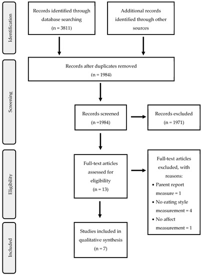 Eating habits are vital to children’s health and well-being, potentially impacting physical, emotional, and psychological development [1,2,3]. Given the exceeding worldwide occurrence of childhood obesity and related health issues, the relevance and urgency of understanding children’s eating habits has become paramount. Studies have found that the prevalence of unhealthy eating habits and obesity in children is alarmingly high, with significant long-term consequences [4,5]. Engaging in unhealthy eating habits during childhood can set a trajectory for adverse health outcomes, including obesity, diabetes, and cardiovascular diseases well into adulthood [6,7,8]. The prevalence of childhood obesity has been connected to unhealthy dietary habits, with high consumption of energy-dense and nutrient-poor foods and a low intake of fruits and vegetables [9]. Furthermore, the consequences of such unhealthy eating habits extend beyond physical health, impacting mental health, cognitive development, academic performance, and emotional well-being [10,11]. Healthy childhood eating habits are crucial as they create the foundation for long-term dietary patterns, influencing the threat of developing diseases like obesity, diabetes, and cardiovascular problems later in life [4,5,12,13]. Beyond biological, social, and environmental factors, emotions have increasingly been recognized for their role in shaping children’s eating habits [14,15,16,17,18]. The importance of emotions in our lives cannot be understated. Emotions shape our experiences, guide our actions, and fundamentally influence our well-being. In the context of eating habits, the theory proposed by psychosomatic pioneer Hilde Bruch has led to an expanded understanding of the role of emotions [19]. Bruch emphasized the crucial role of maternal attitudes during infancy; a mother’s inability to respond empathetically to a child’s emotional needs profoundly impacts the child’s relationship with food [19]. This potentially leads to the child resorting to food as an emotional regulator, thereby blurring the lines between emotional and physical needs [20]. A solid sense of self and body integrity is essential for healthy emotional development and eating behaviors [21]. The relationship between emotions and eating habits is supported both theoretically and empirically. Research has shown that positive and negative emotions greatly influence food choices and eating behaviors, particularly in children. Moreover, negative emotions like stress, anxiety, and sadness have been associated with unhealthy eating habits, such as emotional eating, binge eating, and consumption of calorie-dense, nutrient-poor foods [15,22,23]. Conversely, the influence of positive emotions, like happiness and contentment, has been linked with healthier eating habits, such as increased fruit and vegetable consumption and balanced meal patterns [24,25]. Understanding the impact of emotions on children’s eating habits is crucial for shedding light on the complex interplay between psychological and physical health. This is especially important since children are at an increased risk for eating disorders (EDs) [26,27,28]. Emotional eating, i.e., eating in response to emotional cues rather than physiological hunger, has been associated with developing obesity and eating disorders in childhood [29,30,31,32]. Food is often used as an emotional regulator, providing comfort in the form of high-calorie, palatable foods during challenging times. Over time, this behavior can reinforce unhealthy eating patterns [31,33,34]. Additionally, the emotional experiences of a child can influence their perception of hunger and satiety, disrupting eating patterns and food choices [35,36,37]. Research has increasingly focused on understanding the connection between emotions and eating habits in children [38,39]. For instance, Goldschmidt and colleagues explored the relationships between emotional regulation, dietary restraint, and unhealthy eating in children, demonstrating a significant connection [40]. Similarly, a longitudinal study by Van Strien and colleagues [41] found that emotional eating in children increased over time in response to stress. These studies have predominantly centered on the role of negative emotions, with less emphasis on the influence of positive emotions [42,43,44,45,46,47]. Given the significant public health implications of understanding the relationship between emotions and eating habits, a comprehensive synthesis of the available evidence is needed to inform future research and interventions. This systematic review aims to provide an exhaustive overview of scientific literature on the relationship between emotions and eating habits in children aged 5 to 11. We sought to identify patterns and trends in existing research and spotlight areas for future investigation, thus contributing to a more practical understanding of the role of emotions in shaping children’s eating habits. In turn, the findings could inform the development of targeted interventions to promote healthier eating habits among this vulnerable age group.