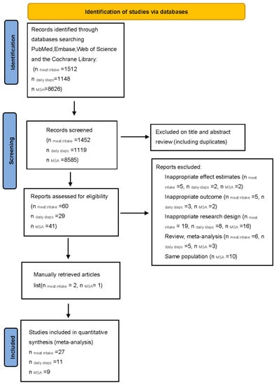 Published studies were included if they were observational prospective studies conducted on human adults (aged ≥18 years) and with reported effect sizes, including hazard ratios (HRs) or relative risks (RRs) with corresponding 95% confidence intervals (95% CIs). All outcomes were classified based on the World Health Organization’s ICD-10 (International Classification of Diseases, 10th revision) or ICD-9 (9th revision) in original studies. If the same data set was published in more than one publication, the most recent publication or that with the largest number of participants was included. The inclusion criteria were (1) studies that analyzed the association between the intake of red meat, processed meat, or the mixed consumption of both as the exposure and mortality from all causes, CVDs, or cancers as the outcome; (2) studies that analyzed the association between MSAs and mortality from all causes, CVDs, or cancers; (3) studies that analyzed the association between daily steps and mortality from all causes, CVDs, or cancers. The exclusion criteria were (1) letters, comments, reviews, meta-analyses, and ecological studies; (2) studies performed on children or adolescents or patients with end-stage cancer or critical illness; (3) studies with insufficient data (e.g., exposure or outcome data).