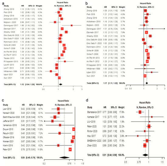 Forest plots of meta-analyses of red and processed meat intake, daily steps, and MSA and all-cause mortality. (a) Red meat intake and all-cause mortality; (b) processed meat intake and all-cause mortality; (c) daily steps and all-cause mortality; (d) MSA and all-cause mortality.