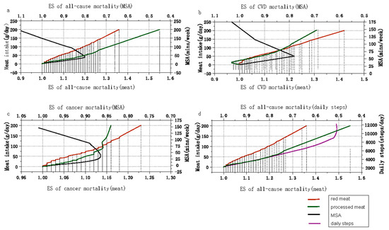 Although numerous reports have revealed the harmful effects of excessive meat intake on mortality risk, few studies provide any insight into how to choose between red and processed meat. Even less evidence is available on how one should choose between walking and MSAs. From the perspective of individual prevention, it is crucial to accurately balance the mortality risk caused by exposure to risk and protective factors according to dose, but, to the best of our knowledge, this has never been evaluated. Therefore, this study aims to reveal a balanced scale by assessing the dose–response relationship between meat intake, daily steps, and MSAs on mortality outcomes based on a systematic review and dose–response meta-analysis.