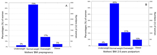 Histogram distributions of women under study according to (A) Mothers’ BMI before gestation and (B) Mothers’ BMI “2–5” years postpartum.
