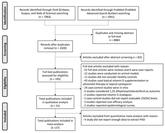 Databases were last accessed on 8 July 2023. We searched using Ovid (Embase, Scopus, and Web of Science) and PubMed, applying search the terms “vitamin D” OR “vitamin D2” OR “vitamin D3” OR “D2” OR “D3” OR “ergocalciferol” OR “cholecalciferol” OR “25-hydroxyvitamin D” AND “psoriasis”. Table S3 reports details on web research. Studies were screened by the two authors (EF and EP) and, after removing duplicate reports, were included. Institutional access and an open-access license allowed access to the full text of the included articles and any disagreements were arbitrated and resolved by discussion with a third author (LP).