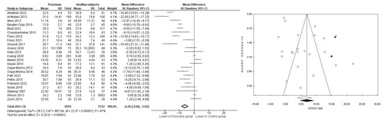A total of 23 studies reported 25(OH)D levels in 9408 subjects, of which 1876 had psoriasis (19.9%) and 7532 were healthy controls (80.1%). When data were pooled, there was high heterogeneity (Tau2 = 29.13, p < 0.00001, I2 = 97%). Patients with psoriasis had lower 25(OH)D level than controls, resulting in a mean difference of −6.26, CI: −8.60, −3.92 ng/dL (21.0 ± 8.3 vs. 27.3 ± 9.8, p < 0.00001) (Figure 2). The funnel plot appeared asymmetrical; therefore, two studies were trimmed, resulting in a re-estimated mean difference of −6.92, CI: 9.34, −4.49 ng/dL, p < 0.00001 (p = 0.003 using Egger’s test and p = 0.731 using Begg’s test).