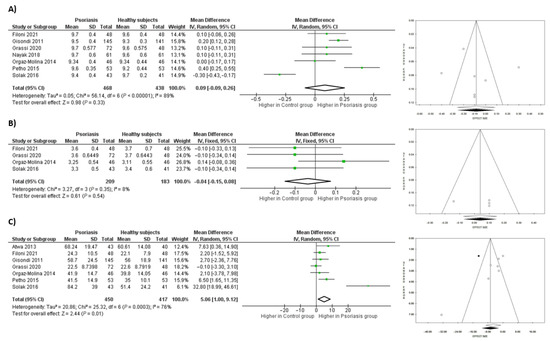 (A) Forest and Funnel plots showing mean difference for (A) Calcium levels [32,33,34,36,41,48,49], (B) Phosphorus levels [33,34,36,49], and (C) PTH levels [32,33,34,36,45,48,49] in patients with psoriasis and healthy controls. Green squares with lines are mean differences and 95% confidence interval. Black dots are trimmed and filled studies, white dots are all studies included in the sub-analysis. White diamond is the unstandardized mean difference, while the black diamond is the unstandardized mean difference after trim and fill correction.