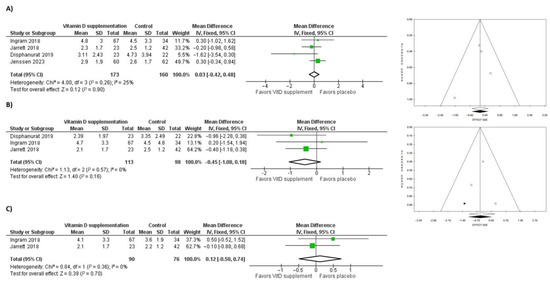 Forest and Funnel plots showing mean differences for PASI after (A) 3 months [50,51,52,53], (B) 6 months [50,51,52], and (C) 12 months [50,52] of vitamin D or placebo supplementation. Green squares with lines are mean differences and 95% confidence interval. Black dots are trimmed and filled studies, white dots are all studies included in the sub-analysis. White diamond is the unstandardized mean difference, while the black diamond is the unstandardized mean difference after trim and fill correction.