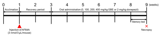 Six-week-old male ICR mice (SPF, certificate #211005) were obtained from Daehan Biolink (Daehan Biolink, Eumseong, Republic of Korea). The mice were kept in an environment with a constant temperature (23 ± 3 °C) and relative humidity (50 ± 10%), following a 12 h light/dark cycle. Standard rodent diets and purified water were available ad libitum. Following 1 week of acclimation to the laboratory conditions, the mice were randomly assigned to one of the following groups: Normal Control group (NC; n = 7), AF64A + Vehicle group (Veh; n = 7), AF64A + Donepezil group (Donepezil; n = 7), and AF64A + post-fermented GBE at 100 mg/kg (GBE100; n = 7), 200 mg/kg (GBE200; n = 7), and 400 mg/kg (GBE400; n = 7). Mice were anesthetized using ketamine (Yuhan Corporation, Seoul Republic of Korea) and rompun (Bayer Korea, Seoul, Republic of Korea) and positioned in a stereotaxic frame. To induce cognitive deficits, AF64A cholinotoxin was administered as previously described [18]. Following the skin incision, a fresh AF64A solution (3 nmol/3 μL/mouse) was infused into the right ventricle at the following stereotaxic coordinates from the bregma: posterior 0.6 mm, lateral 1.1 mm, and ventral 2.0 mm, at a flow rate of 0.5 μL/min. After a 2-week recovery period, either vehicle (0), 100, 200, and 400 mg/kg of GBE, or 2 mg/kg of donepezil, was orally administered once a day for 6 weeks (Figure 1). Prior to administration, mice were fasted for 4 h, with food and water provided ad libitum post-administration. Vehicle administration was performed concurrently with other study compounds for comparison purposes. All animal experiments were conducted following the Standard Operation Procedures of the Laboratory Animal Center at Chungbuk National University (CBNU, MFDS Approval #2), Republic of Korea. The protocol was approved by the Institutional Animal Care and Use Committee of CBNU (#CBNUA-1398-20-01).