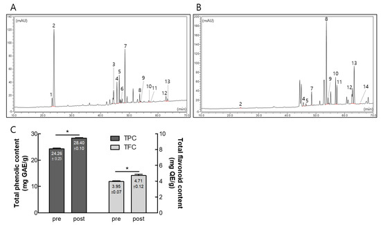 Contents of ginsenoside, total polyphenols, and flavonoids in pre- and post-fermented ginseng berry extract (GBE). (A,B) High-performance liquid chromatography (HPLC) chromatograms of ginsenosides in pre- (A) and post- (B) fermented GBE. Peaks were analyzed based on HPLC chromatograms of the ginsenoside standard mixture. (C) Total amounts of phenol (mg gallic acid equivalents per gram of dry extract) and flavonoid (mg quercetin equivalents per gram of dry extract) compounds. Data are presented as mean ± SD in triplicates. * p < 0.05, significantly different from pre-fermented GBE.
