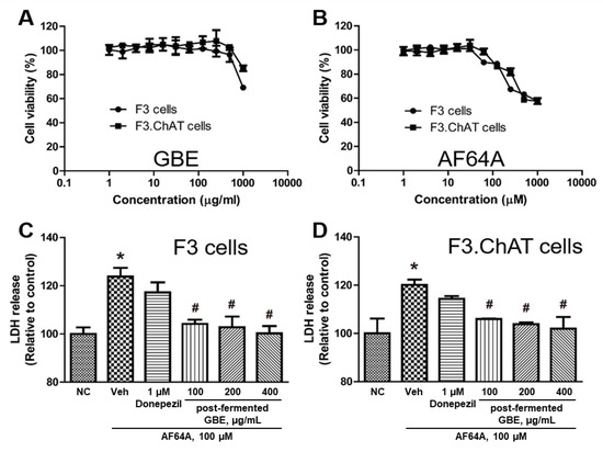 To confirm the protective effect, the cytotoxicity of post-fermented GBE and AF64A was evaluated at various concentrations (0–1000 μM, respectively) on F3 and F3.ChAT cells. Overall, post-fermented GBE was almost non-toxic, but toxicity was observed at the highest concentration (1000 μg/mL) (Figure 4A). In the case of AF64A (Figure 4B), toxicity was observed at 63 μM, and the experiment was conducted at 100 μM, at which 80% of the F3 and F3.ChAT cells survived. The LDH assay showed that AF64A significantly increased the release of LDH from the F3 and F3.ChAT cells (Figure 4C,D); however, post-fermented GBE treatment significantly decreased it in a dose-dependent manner. However, treatment with donepezil (1 μM) as a reference drug did not show a protective effect.