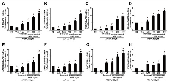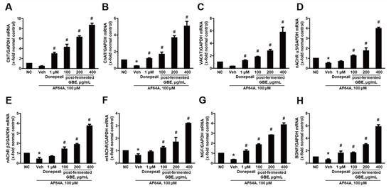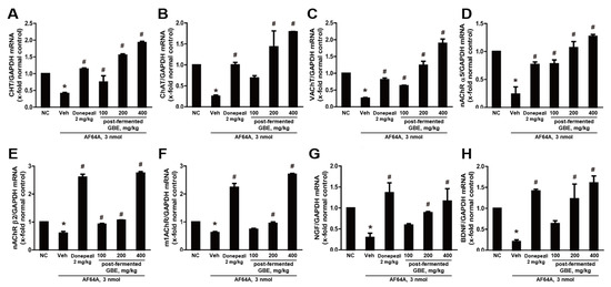Effects of post-fermented GBE on the cholinergic pathway in AF64A-induced brain damage in mice (n = 5 in each group). (A) CHT, (B) ChAT, (C) VAChT, (D) nAChR α5, (E) nAChR β2, (F) m1AChR, (G) NGF, and (H) BDNF gene expression were analyzed by real-time PCR and normalized to GAPDH. Data are presented as mean ± SD in triplicates. * p < 0.05, significantly different from normal control (NC); # p < 0.05, significantly different from vehicle.