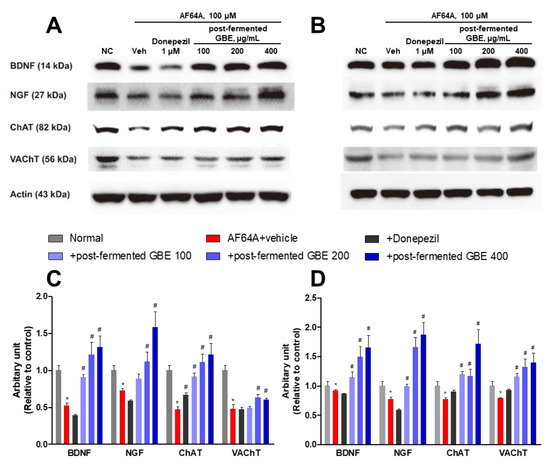 Effects of post-fermented GBE on protein expression in AF64A-induced damage in F3 (A,C) and F3.ChAT cells (B,D). (A,B) Representative bands of F3 (A) and F3.ChAT (B) cells. Protein expression was analyzed by Western blotting. (C,D) The band densities of F3 (C) and F3.ChAT (D) cells were quantified in arbitrary units and normalized to actin. Data are presented in triplicates as mean ± SD. * p < 0.05, significantly different from normal control (NC); # p < 0.05, significantly different from vehicle.