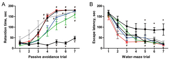 Recovery of cognitive function in AF64A-induced memory deficit animals (n = 7 in each group): (A) passive avoidance performance and (B) Morris water maze performance. The endpoint was set at 180 s if the animals stayed in the light chamber in the passive avoidance test or failed to find the platform in the Morris water maze test. ●, Normal; ■, AF64A (3 nmol) + vehicle; ▲, AF64A (3 nmol) + Donepezil (2 mg/kg); ▼, AF64A (3 nmol) + post-fermented GBE (100 mg/kg); ◆, AF64A (3 nmol) + post-fermented GBE (200 mg/kg); ●, AF64A (3 nmol) + post-fermented GBE (400 mg/kg). Data are presented as mean ± SD in triplicates. * p < 0.05, significantly different from normal control (NC); # p < 0.05, significantly different from vehicle.