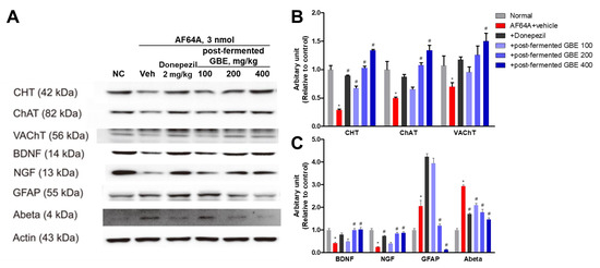 Effects of post-fermented GBE on protein expression in AF64A-induced brain damage in mice (n = 5 in each group). (A) Representative bands of brain tissues in mice. Protein expression was analyzed by Western blotting. (B,C) The band densities of brain tissues in mice were quantified in arbitrary units and normalized to actin. Data are presented as mean ± SD in triplicates. * p < 0.05, significantly different from normal control (NC); # p < 0.05, significantly different from vehicle.
