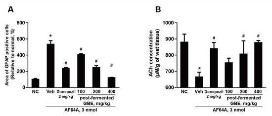 In the Western blotting (Figure 10), the expression of CHT, ChAT, VAChT, BDNF, and NGF was significantly decreased by AF64A injection. However, their expression was increased by the administration of post-fermented GBE. Also, the expression of GFAP and amyloid beta (Aβ) was significantly increased by AF64A injection. However, their expression was significantly decreased by the administration of post-fermented GBE.