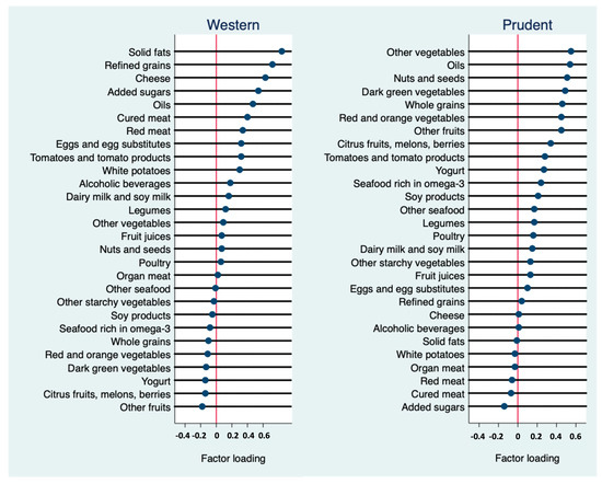 Dietary patterns were constructed using factor analysis. Initially, all food items were collapsed into 28 food groups, similar to the grouping in the Food Patterns Equivalents Database (FPED) [33]. Food code from the USDA for an individual’s two-day dietary recalls of NHANES was compared to the USDA food code of FPED 2011–2012. As FPED 2011–2012 presents food and beverage components per 100 g, the grams of an individual’s food intake were divided by 100 g and multiplied by the corresponding number of FPED equivalents in FPED 2011–2012. The number of factors to retain was determined using three criteria: (1) examining the scree plot, which showed the eigenvalues for each factor in order from highest to lowest; (2) selecting only factors with eigenvalues greater than 1; and (3) interpretability of the identified patterns. Varimax rotation was used to help with the interpretation of the identified patterns, which minimizes the correlation between factors. The factor loadings were examined to identify the most important contributors in each dietary pattern. Each individual was assigned a factor score for each dietary pattern based on the factor loadings and actual food intake. The derived dietary patterns were named based on their resemblance to the prudent and Western patterns in existing publications and dietary guidelines.