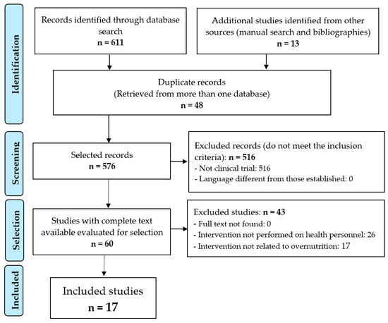 The study with the largest population was performed by Van Wier et al. [35], with N = 1386 health-care workers, while the study with the smallest population was conducted by Stites et al. [27], with 26 employees. This population was mostly female, except in the study carried out by Van Wier et al. [35], albeit four (23.53%) studies did not report the male/female ratio [23,24,34,37]. The participants were overweight or obese in 14 out of 17 trials, although one trial selected an obese population [26] and two studies worked with an overweight population [35,37].
