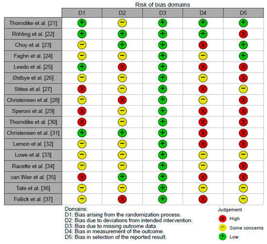 The tool modified by RoB.2 [19,20] was utilized to assess the potential biases of the trials included in the review: bias was evaluated using the criteria of high, low, or doubtful bias for the dimensions: D1 Bias arising from the randomization process, D2 Bias due to deviations from intended intervention, D3 Bias due to missing outcome data, D4 Bias in measurement of the outcome, and D5 Bias in selection of the reported result.