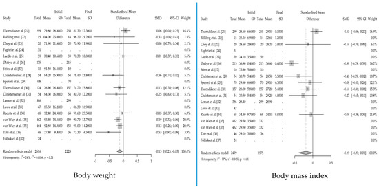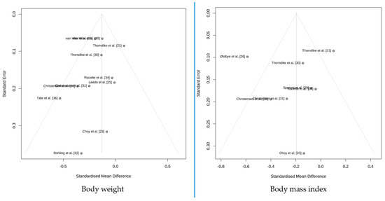 The funnel plot shows that publication bias was not particularly pronounced for body weight or body mass index, see Figure 3.