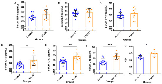 Effect of L. plantarum YRL45 on the secretion of cytokines in serum (n = 11) and peritoneal macrophages phagocytic activity of mice (n = 6). (A) The content of TNF-α in serum. (B) The content of IL-6 in serum. (C) The content of IFN-γ in serum. (D) The content of IL-10 in serum. (E) The content of IL-12 in serum. (F) The content of IL-1β in serum. (G) The phagocytic activity of peritoneal macrophages. * p < 0.05, ** p < 0.01, *** p < 0.001.
