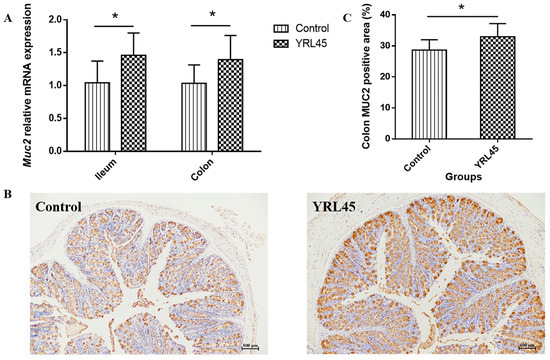The main component of intestinal mucus is the mucin MUC2 secreted by goblet cells. It plays an essential part in preventing pathogenic bacteria infection and inflammation [21]. The gene expression levels of Muc2 in the ileum and colon of mice were determined, and Figure 2A illustrated that oral administration of L. plantarum YRL45 significantly up-regulated the expression of Muc2 (p < 0.05). Through an immunohistochemical analysis, it was found that the positive area of MUC2 in the colon was increased markedly in the YRL45 group (p < 0.05) (Figure 2B,C). The bacteriocin-producing L. plantarum YRL45 promoted the expression of intestinal mucin MUC2 in the mice, which might be favorable for protecting the intestinal mucosa from pathogens and exogenous harmful substances and boosting the lubrication and protection function of the mucus layer.