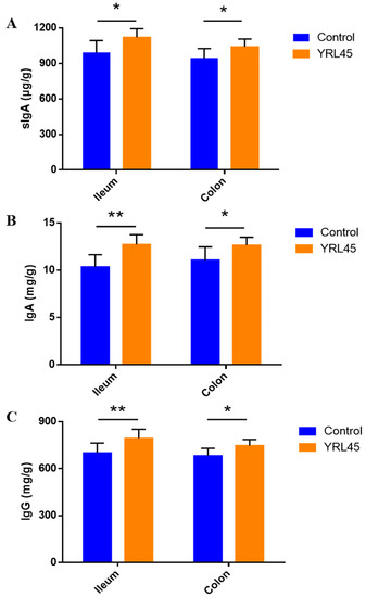 Immunoglobulins are important immune active molecules that play a significant role in enhancing the organism’s immunity and improving defense capability [24]. Changes in the secretory immunoglobulin sIgA in the intestine of mice were measured after strain intervention. Figure 5A showed that the levels of sIgA in the ileum and colon were notably increased in the YRL45 group (p < 0.05). The up-regulation of intestine sIgA helped inhibit pathogenic bacteria from invading the gut mucosal surface and blocked infection to body, thus protecting the integrity of the mucosal barrier and strengthening the immune function of intestine. The contents of IgA and IgG in the mice intestine were detected, and it could be seen that the administration of L. plantarum YRL45 led to increased IgA and IgG in the ileum (p < 0.01) and colon (p < 0.05) (Figure 5B,C), which contributed to anti-infection and anti-inflammatory functions. Bacteriocin-producing L. plantarum YRL45 promoted the secretion of sIgA, IgA and IgG in the intestine, which was of great significance for enhancing intestinal immune function.