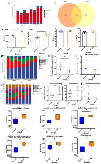 To clarify the influence of L. plantarum YRL45 on mice intestinal flora is essential for exploring the function of bacteriocin-producing probiotics on regulating the intestinal barrier. Feces from mice were collected for 16S rRNA gene sequencing and the data showed that the number of OTUs in the YRL45 group was higher than that in the control group (Figure 7A,B). The results of α-diversity of intestinal flora were revealed in Figure 7C. L. plantarum YRL45 intervention notably increased Chao 1 and Observed_species (p < 0.05), and there was no remarkable change in Shannon and Faith_pd (p > 0.05), indicating that L. plantarum YRL45 led to an increase in the richness of microbial communities, but no remarkable difference in diversity or uniformity was found.