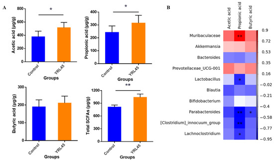 Effect of L. plantarum YRL45 on SCFAs in feces of mice (n = 6). (A) The contents of acetic acid, propionic acid, butyric acid and total SCFAs in feces. (B) The association heatmap of gut microbiota and SCFAs. * p < 0.05, ** p < 0.01.