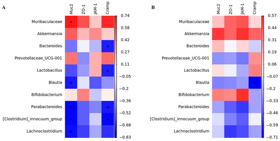 Correlation heatmap of gut microbiota and intestinal key genes in mice. (A) Correlation heatmap of gut microbiota and intestinal key genes in ileum. (B) Correlation heatmap of gut microbiota and intestinal key genes in colon. * p < 0.05.