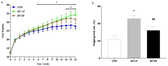 Trends for changes in body weight over 14 weeks in the MPC group (a) and weight growth rate (b). Values are presented as mean ± SD, n = 10 per group. * p < 0.05, HF-LP group compared with the CON group; # p < 0.05, HF-LP group compared with the HF-HP group, ** p < 0.01, HF-LP group compared with the CON group; ## p < 0.01, HF-LP group compared with the HF-HP group. MPC, milk protein concentrate; SD, standard deviation; CON, control; HF-LP, high-fat/low-protein; HF-HP, high-fat/high-protein.