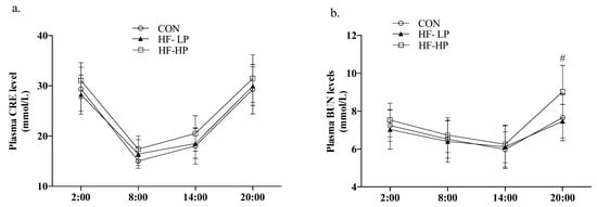 Effect of high-protein diet on circadian rhythm of plasma CRE and BUN level. (a) Circadian rhythm variation in plasma CRE level, (b) Circadian rhythm variation in plasma BUN level; Data are expressed as the mean ± SD (n = 10 rats per group); # p < 0.05, HF-LP group compared with the HF-HP group.